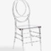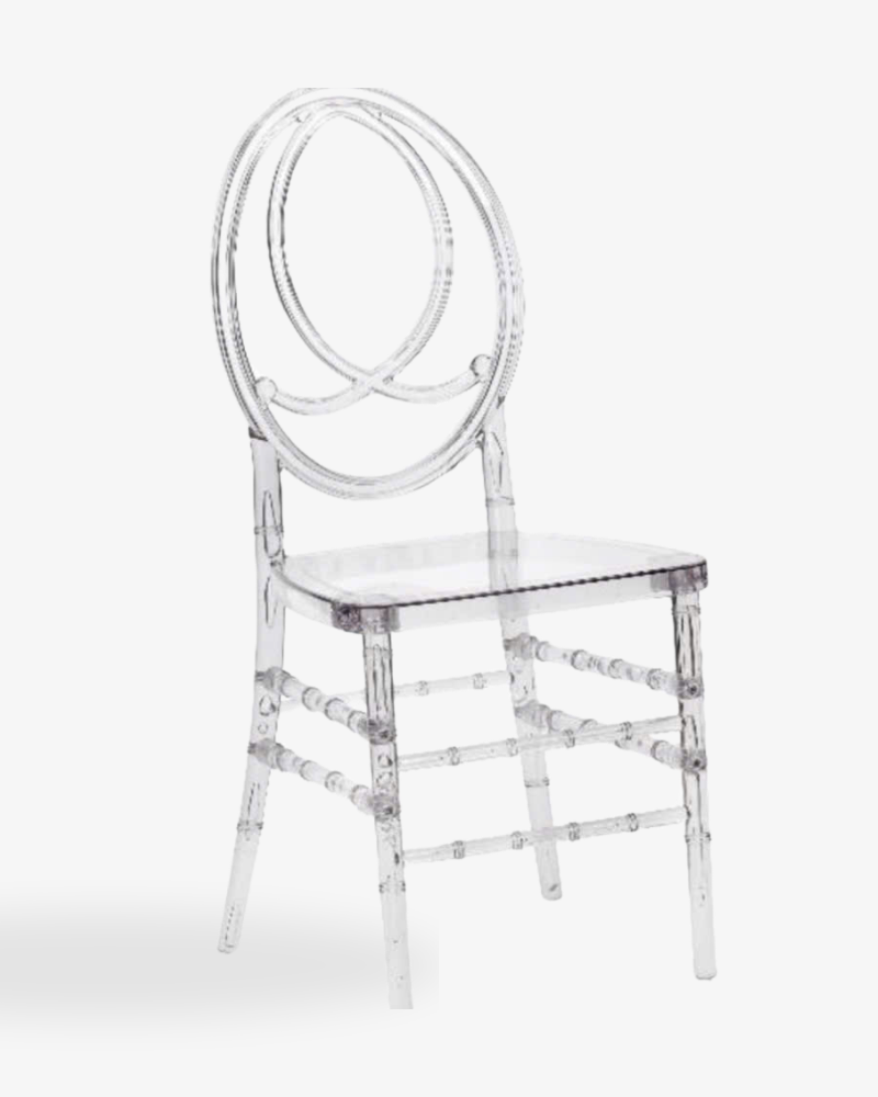 Lưng ghế được tạo hình từ 3-4 vòng tròn elip lồng ghép vào nhau, tượng trưng cho sự gắn kết và viên mãn. Thiết kế này không chỉ đẹp mà còn hỗ trợ nâng đỡ cột sống khách mời một cách thoải mái nhất. Sự thanh thoát của khung hình trong suốt giúp chiếc ghế trở thành một vật trang trí “tàng hình”, tôn vinh triệt để bộ đồ ăn, khăn trải bàn và hoa tươi trên mặt bàn tiệc.